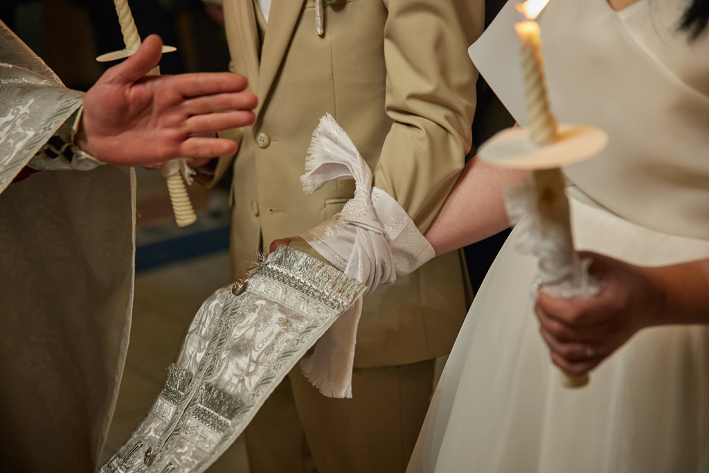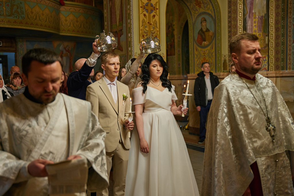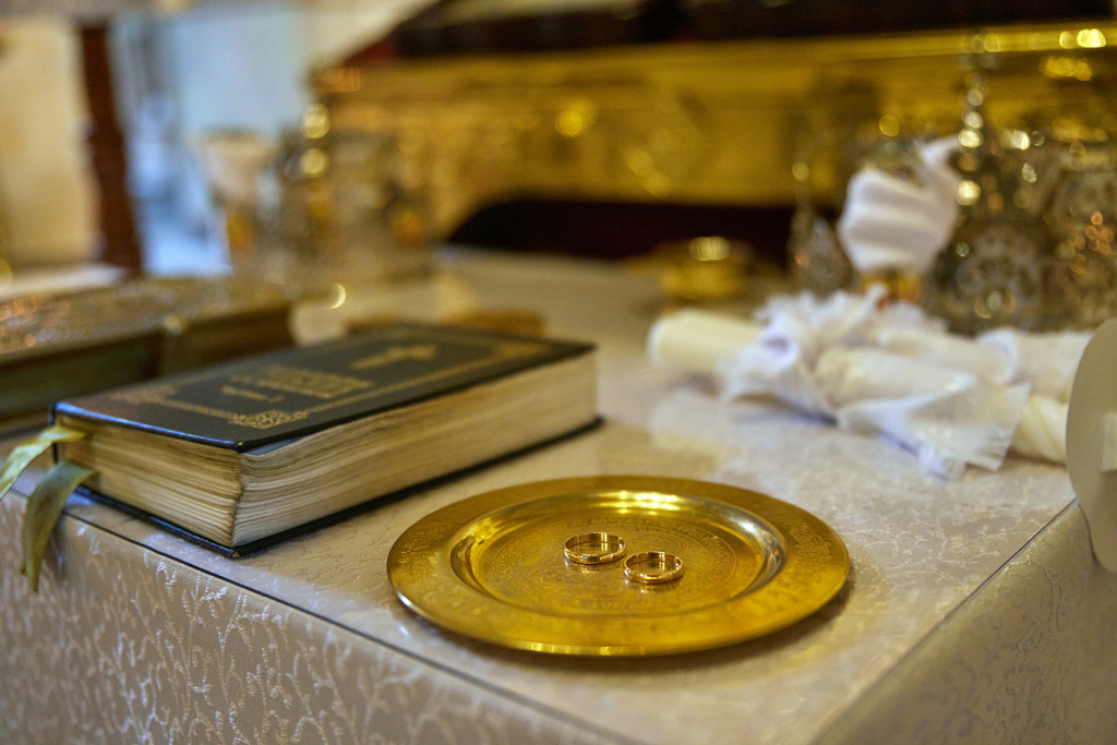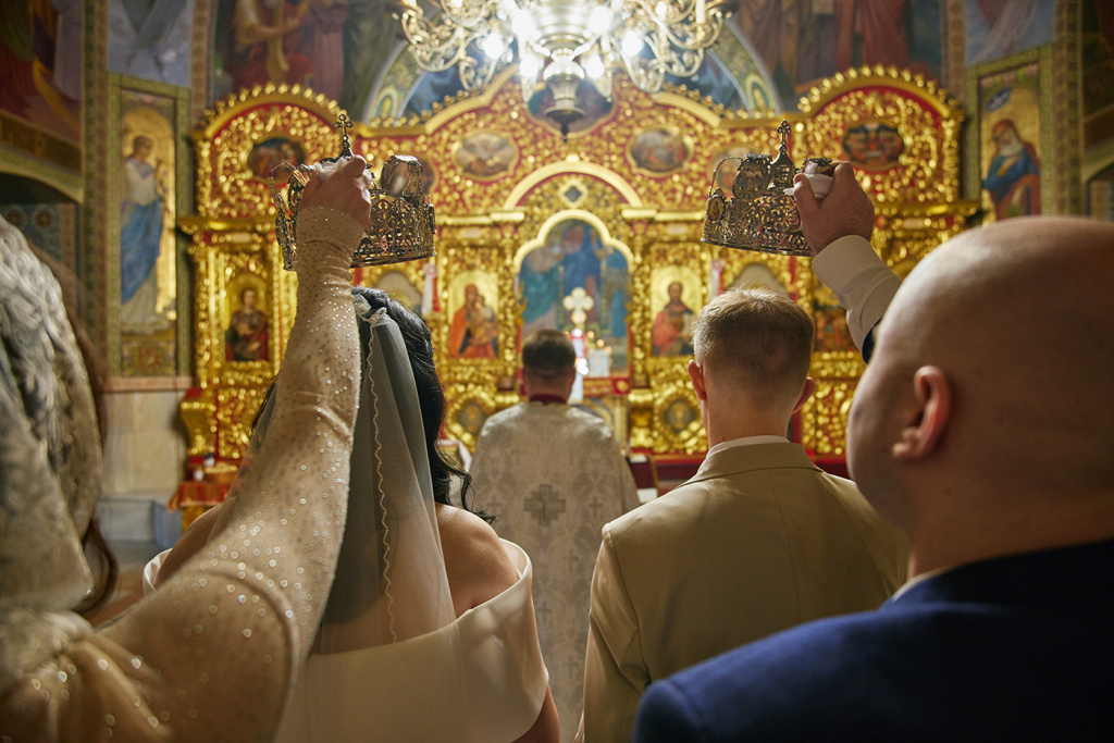 Венчание соткано из деталей: горящие свечи в руках, обручальные кольца, короны над головами, иконы и расписные своды. Важно не упустить эти мелочи, ведь именно они формируют историю дня.